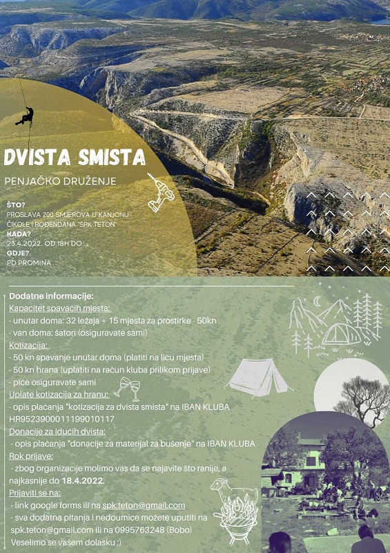 Radujemo se zato penjačkom okupljanju "Dvista smista" di će se proslavit rođendan SPK Tetona i svega do sada napravljenog u kanjonu Čikole. Datum je 23.04. , detaljni info vam je na fotografiji, a link za prijave ovdje.