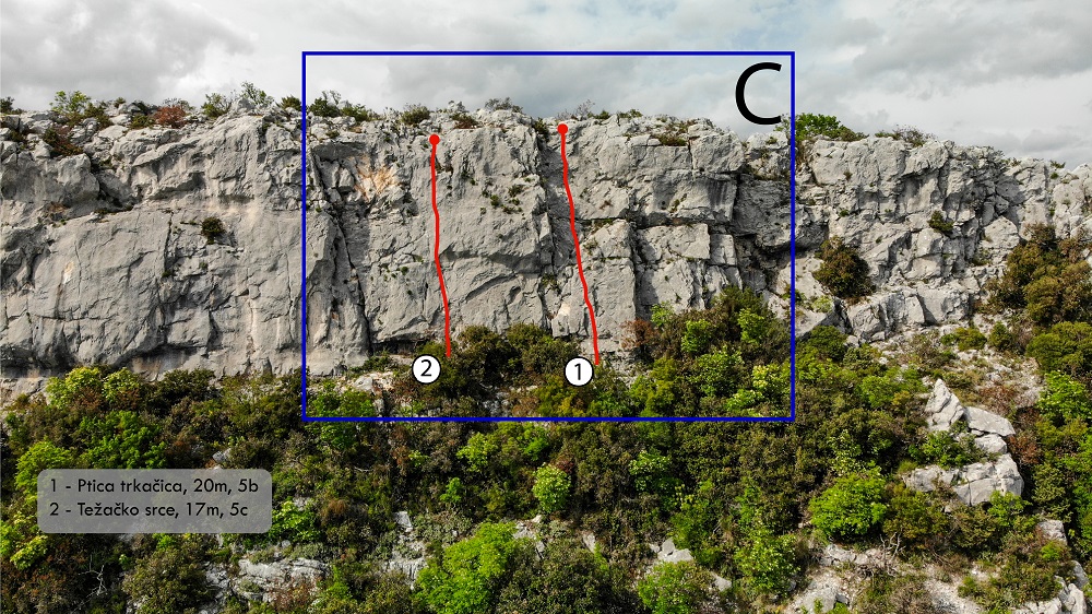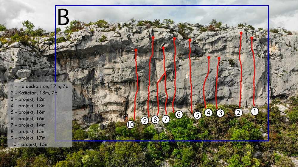 Potencijal je otprilike 25 smjerova, prosječne težine 7-nešto, ali naći će se i nešto šestica za zagrijavanje kao i osmica za upornije. Visina smjerova je 15-20 m uz par izuzetaka koji su u nedostatku hvatišta skraćeni.