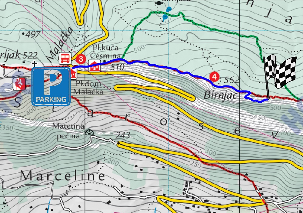 Iz pravca Splita u Kaštel Starom skrene se desno prema prijevoju Malačka. Nakon 7 km dolazi se na prijevoj gdje je parking s lijeve i desne strane ceste. Prema zapadu je 'stara' Malačka, dok se za novi sektor 'Birnjac' ide prema istoku (prema Splitu). Put kreće makadamom 200 m do Pl. Kuće Česmina odakle počinje planinarski put prema vrhu Sv. Ivan. Planinarski put je dobro utaban i pruža se grebenom bez velikih uspona ili silazaka. Nakon 10 min dolazi se do malog neizraženog vrha Birnjac gdje je raskrižje planinarskih puteva. Nastavlja se ravno grebenom prema Sv. Ivanu još 2 min gdje je skretanje prema penjalištu (na kamenu s desne strane piše Penjalište). Nakon još 2-3 min markiranog puta dolazi se do penjališta.
