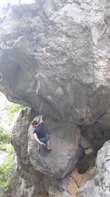 100metri niže, izbornik Luka Trumbić svjesno vrši harakiri padajući sa samog vrha Moskita (8b). Zašto, Kako??? Zato jer pravi trener svojim primjerom mora pokazat dici i loše i dobro. Bravo Trumba, virujemo da ćeš nać vrimena u svom notesu za skoknit dovršit posal. Tebi se zaletit u "petici" do Paklenici je ka nama u redakciji obradit dvi-tri fotke..