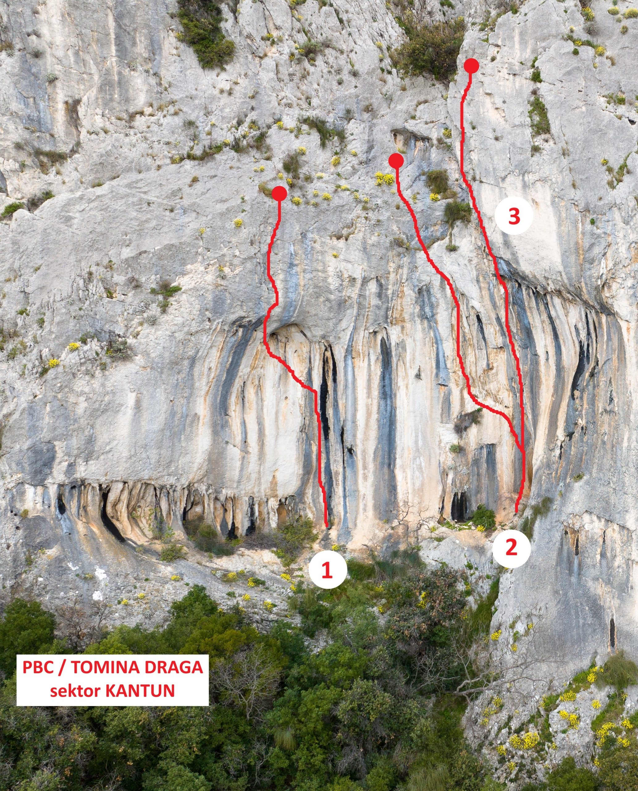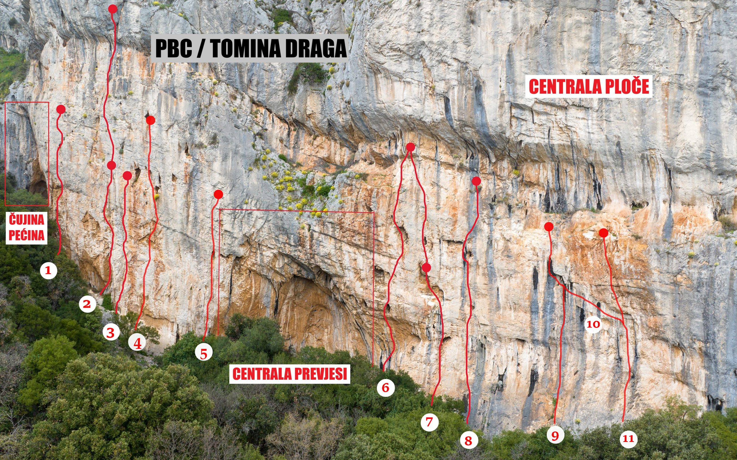 Centrala - prevjesi: 1. Projekt ,25m / 2. Peaky Blinders (7c),12m / 3. Endorfin (6c+),10m / 4. Trio Rio, (6b),9m / 5. Pikanterija (6c),12m / 6.Trio Rio X (7a+),15m / 7. Dritura (7b+),12m / 8. Gladijajator (7b+),15m / 9. Projekt / 10. 4 stupnja separacije (7c),25m
