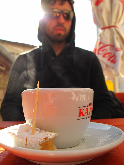 Uobičajen dan u Prilepu započinje kaficom na trgu (5kn). Onda ide skok do pazara po osnovne energetske namirnice koje su nas držale u punom naponu cili dan - pčelinje saće i halvu! Još kad bi tome dodali par kuvanih jaja od domaćih kokošiju i dec čudotvornog napitka Boze - sasvim je sigurno da bi nas doping kontrola štopala baš ka šta je to učinija i oni graničar ispod Dubrovnika.Nakon prvog rest daya - osjetili smo da imamo gibanje, a i koža se djelomično stabilizirala. Neki lipi projekti su nam se počeli muvat po glavi, pa smo ušli u sending mode.