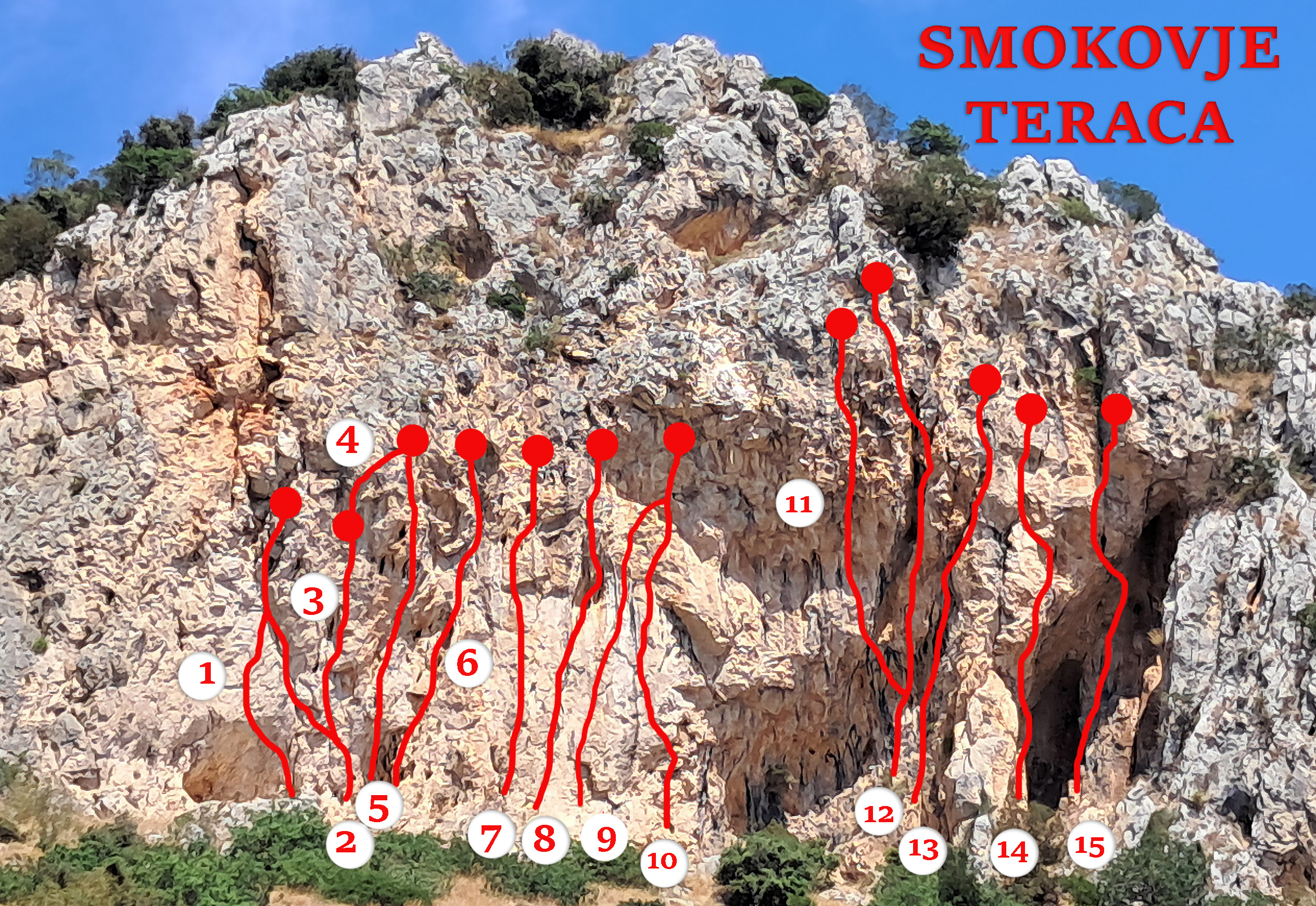 Sektor TERACA: 1.Hulk Hogan (7a+),10m / 2.Madre Badessa (6c),12m / 3.Mater plače (6c+),12m / 4.Mater plače jače (7a+),12m / 5.Ćaća viče (7b),20m / 6.In bonu fidis (6a+),20m / 7.Mudlanje (6c),22m / 8.Mister No (6b+),20m / 9.C je to (6c),22m / 10.Tuta forza (7a),22m / 11.Porketa (7b+/c),22m / 12.Senjutsu (7a),25m / 13.Šentada (6a+),22m / 14.Homo ludens (7a+),18m / 15.Orange crush (7c),20m