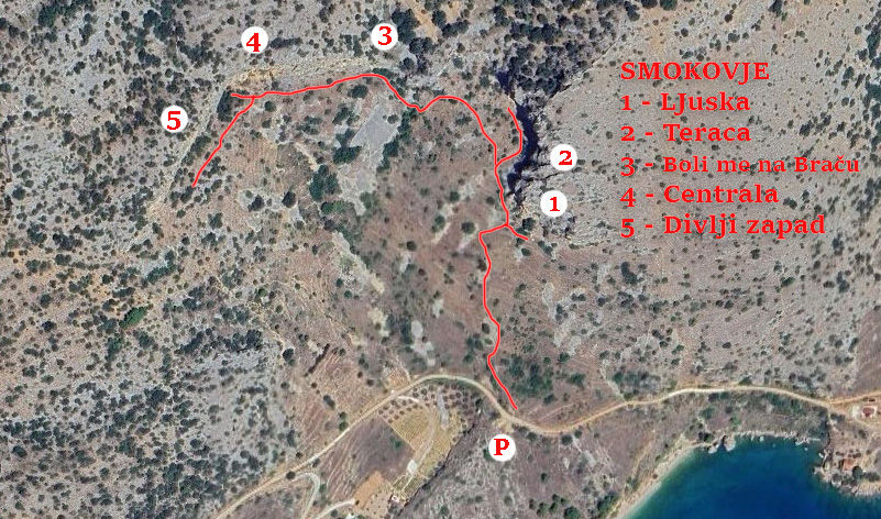 Pristup penjalištu: Smokovje se nalazi 4km istočno od Bola, a do njega se dolazi makadamom koji starta u Bolu iznad samostana. Od parkinga (GPS 43.262357, 16.710295) do sektora se dolazi označenom stazom. Najbliži "Ljuska" je udaljen 5min. hoda, a najdalji "Centrala" i "Divlji zapad" su na 15min. hoda.