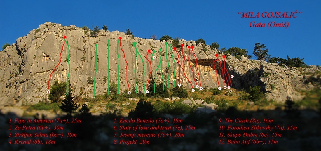 1. Podgrac 19m 7b?, 2. Vodica 19m 7a?, 3. Brus 18m 7a+? 4. Pocelje 18m 6b, 5. Gomila 27m 6b/b+,